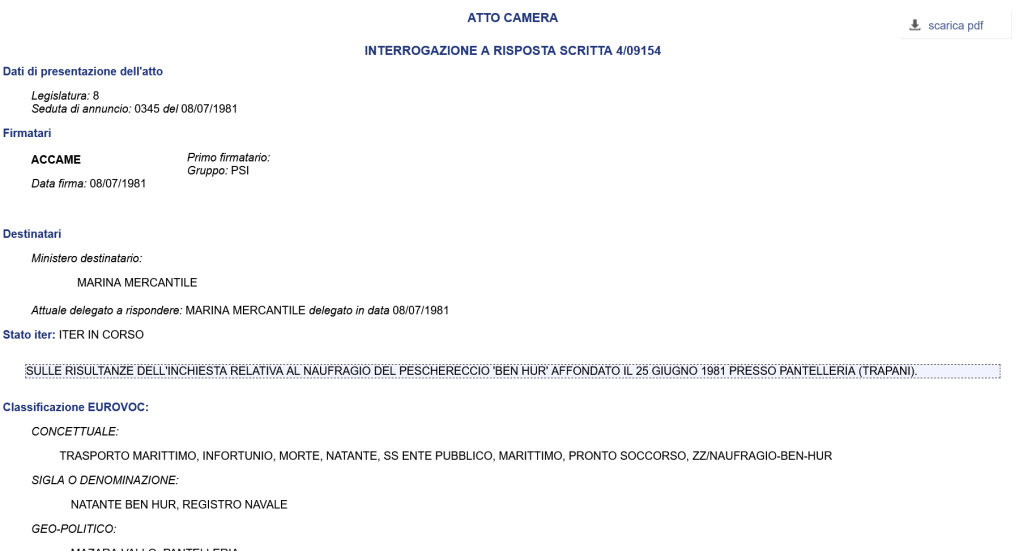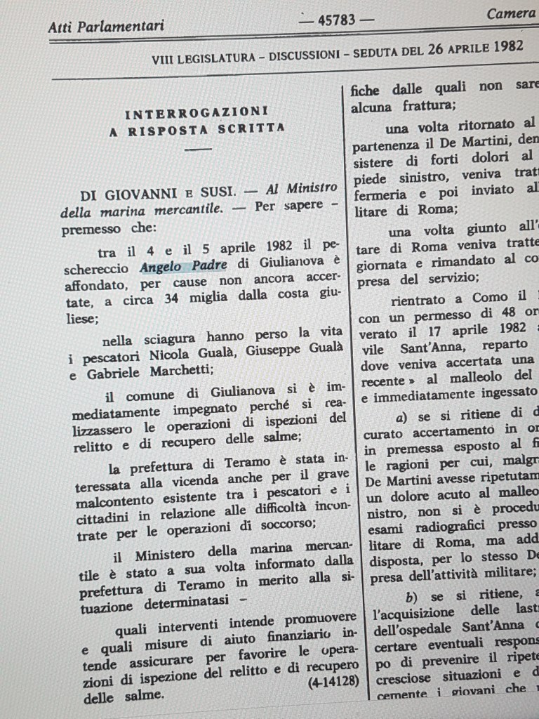 Verità sepolte dai segreti di Stato. Accade in Italia. Lavoratori del mare: assassinati dalla guerra in tempo di pace. Tragedie rubricate erroneamente come incidenti; però si tratta di stragi militari. Gli anni Ottanta sono a dir poco tragici per la marineria italiana. Il 14 ottobre 1978 viene inabissata a largo di Martinsicuro la motobarca Francesco Padre. Il 15 giugno 1981 viene colpito e affondato il peschereccio Ben-Hur nei pressi di Pantelleria. Il 2 marzo 1982 viene trasconato sul fondo il peschereccio Agostino Padre a largo di Trapani. Il 27 marzo 1982 cola a picco il motopesca Prudentia di Mazara del Vallo. Il 5 aprile 1982 va a fondo l’Angelo Padre al traverso di Giulianova nell’Adriatico. Il 16 febbraio 1987 viene squarciato il Massimo Garau nel Canale di Sicilia.