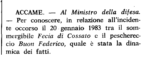 Alla voce ignota: collisioni militari in mare. Mar Ligure, 20 gennaio 1983: il fiammante sommergibile della Marina Militare italiana Carlo Fecia di Cossato, appartenente alla 1ª serie della Classe Sauro investe il peschereccio Buon Federico.