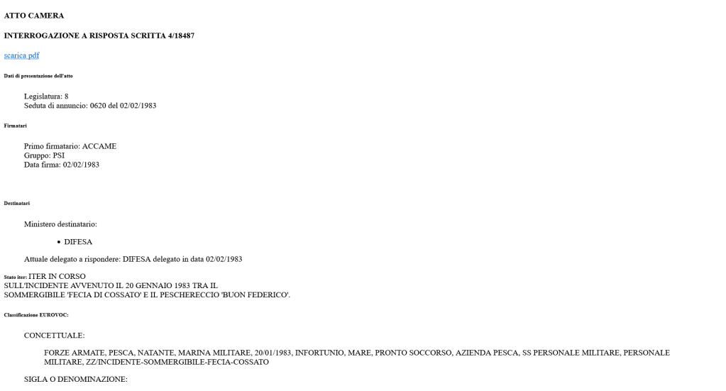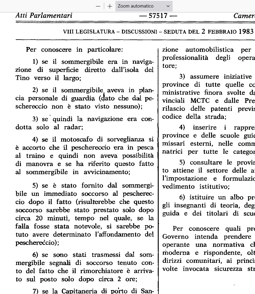 Sulle pagine di cronaca dell’epoca non si scorge una sola riga sul drammatico evento. Tuttavia il 2 febbraio 1983 Falco Accame (ex ufficiale della Marina Militare, nonché presidente della commissione parlamentare Difesa), interroga il governo tricolore (Fanfani V) con l’atto di sindacato ispettivo numero 4/18487, a tutt’oggi senza risposta.