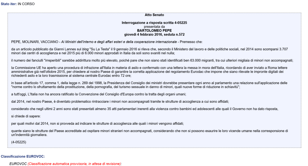 Non è tutto. L’articolo 17 comma 1 della legge 3 agosto 269 dell’anno 1998, stabilisce che “Il presidente del Consiglio dei ministri presenta ogni anno al parlamento una relazione sull’attività svolta”, o più precisamente: una “relazione al Parlamento sull’attività di coordinamento in tema di prostituzione, pornografia, turismo sessuale in danno di minori quali nuove forme di schiavitù”. Giorgia Meloni occupa la carica governativa di primo ministro dal 22 ottobre 2022: il suo è il 68° esecutivo della Repubblica italiana, il primo della XIX legislatura. E non vi è traccia, a tutt’oggi, di questo importante compito. Come mai? Troppo indaffarata a ordinare di spiare i giornalisti indipendenti? Insomma, dov’è la relazione in materia della Meloni inerente l’anno 2024 e quella dell’anno precedente? Iter in corso dopo 9 anni: l’interrogazione parlamentare numero 4/05225 datata 4 febbraio 2016, non ha avuto ancora risposta dal governo italiano. Perché?