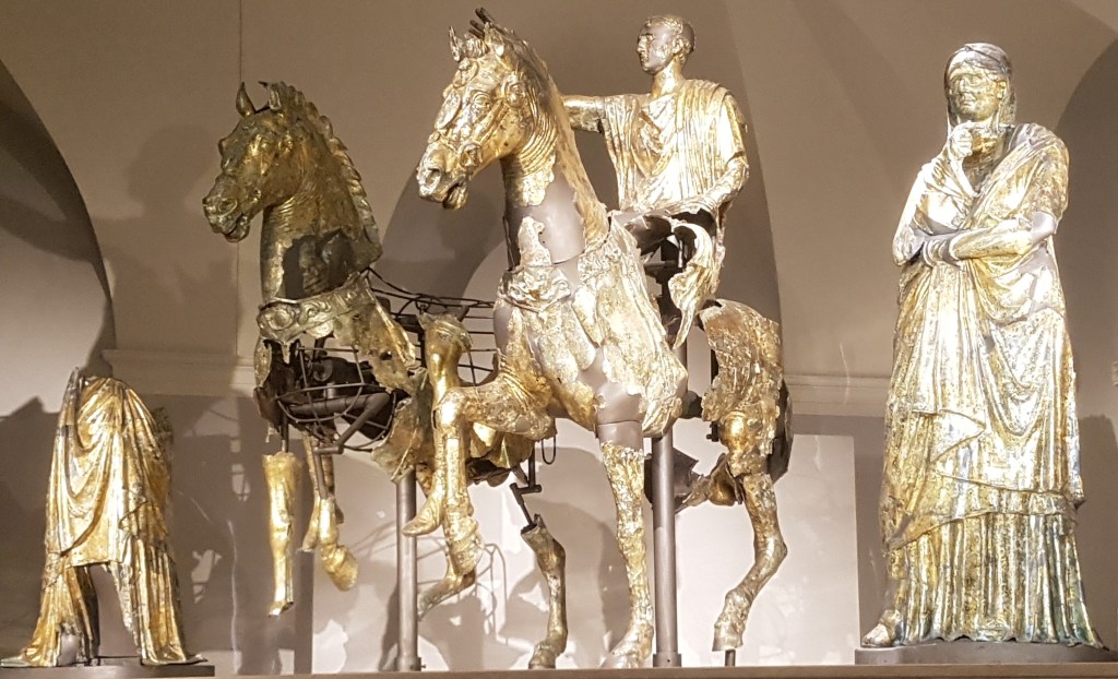 Ritrovati a Pergola ma contesi da Ancona. La vicenda ha origine nel giugno 1946, quando, a seguito di un ritrovamento casuale in località Santa Lucia di Calamello, presso Cartoceto, nel comune di Pergola, veniva rinvenuto un un gruppo statuario equestre di bronzo dorato di epoca romano-imperiale, che rappresenta una delle scoperte archeologiche più interessanti degli ultimi 50 anni.