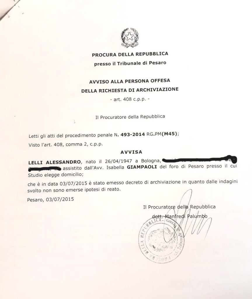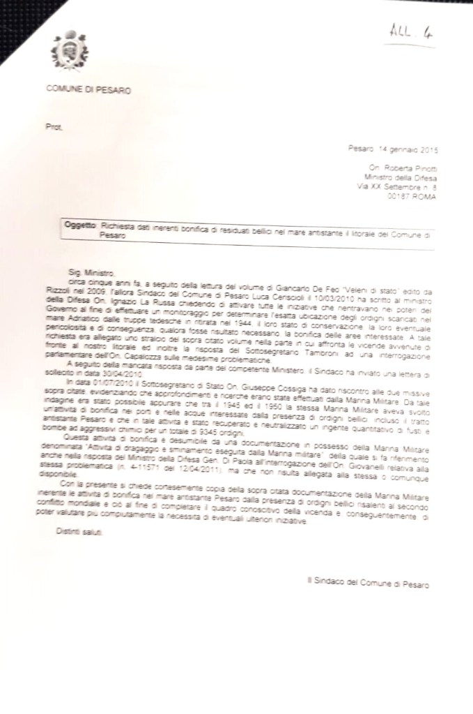 Tant’è che nel 2015, l’allora sindaco di Pesaro, Matteo Ricci, chiede al ministro della Difesa, la documentazione relativa alla presunta bonifica dei fondali marini dalle insidie belliche. A tutt’oggi, non è giunta alcuna risposta. In compenso, però, nonostante una denuncia ben comprovata del Comitato Nazionale Bonifica Armi Chimiche presentata da Alessandro Lelli e sottoscritta anche da Italo Campagnoli alla Procura della Repubblica di Pesaro, il procedimento giudiziario è stato incredibilmente archiviato dal procuratore Palumbo, poiché la locale Capitaneria ha fornito notizie menzognere e depistatorie, mentre l’Arpam ha effettuato prelievi nei punti sbagliati. Volutamente? Comunque, il risultato era programmato: tutto a posto e silenziato, fino ad oggi.