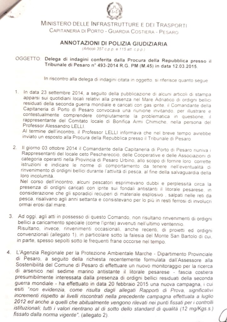 “Alcuni studi bibliografici, le interviste poste agli operatori della pesca e le indagini condotte in alcune aree pilota hanno permesso di evidenziare come la presenza di armi chimiche nei mari italiani sia accertata così come la presenza di prodotti di degradazione dell’iprite”.