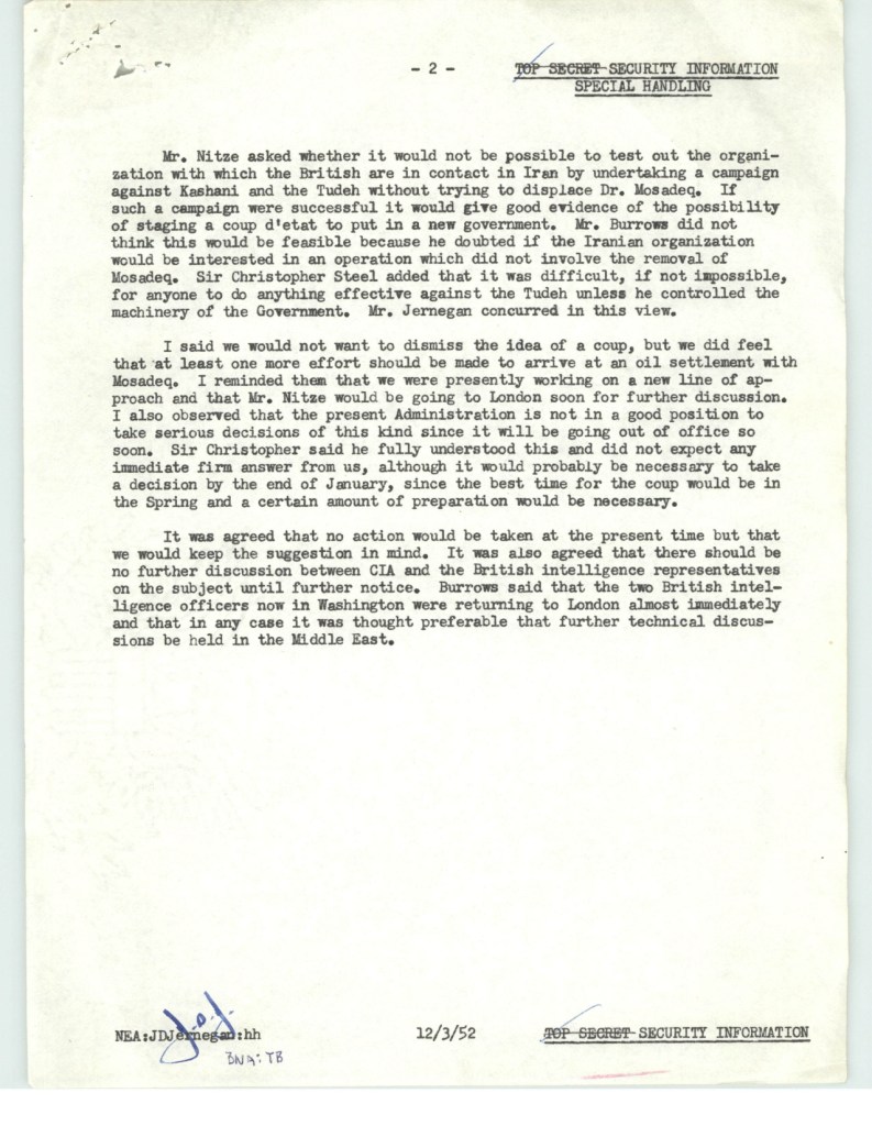 Il secondo promemoria, dal titolo simile, ovvero “Proposta britannica di organizzare un colpo di stato in Iran”, e datato 3 dicembre 1952, è il record del Dipartimento di Stato dell’incontro con Steel (data poco chiara).