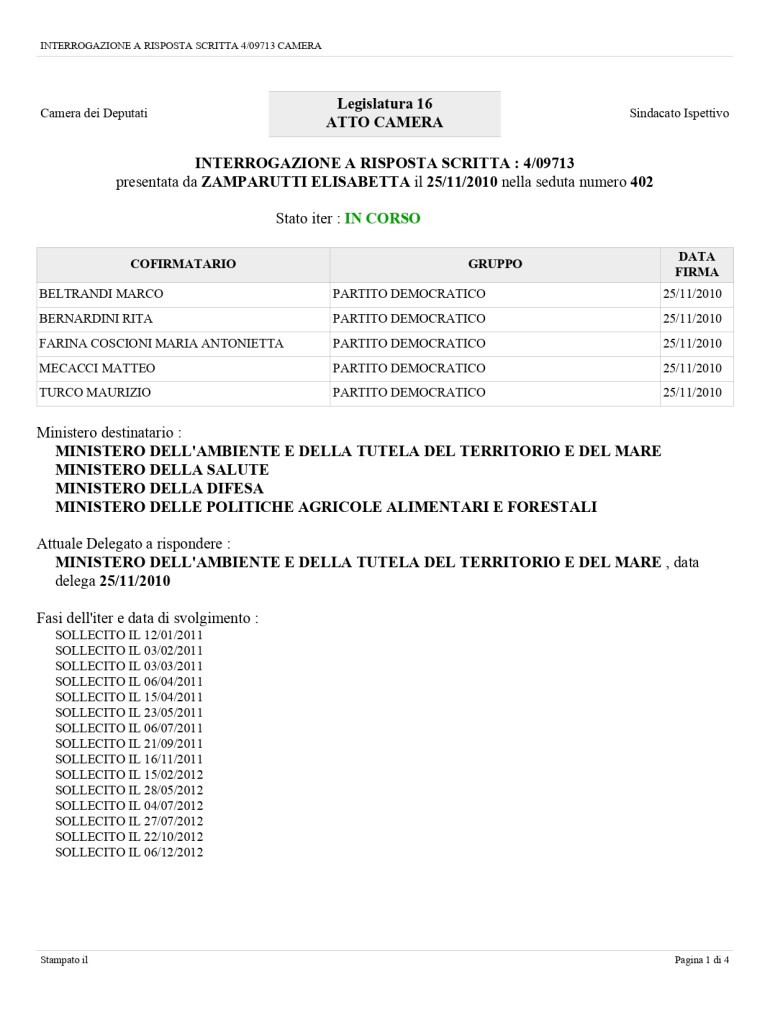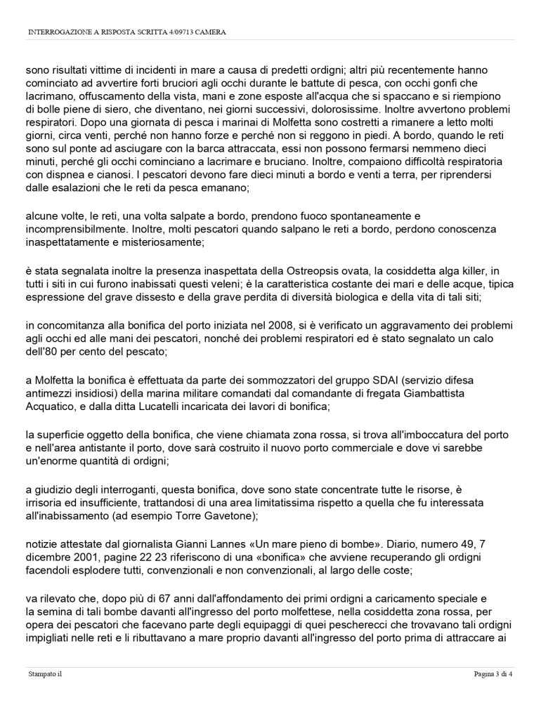 Sul tavolo delle prove raccolte c’è inoltre la conferma del governo italiano a firma del sottosegretario alla Marina Mercatile Tambroni, in risposta il 20 novembre 1951 alla documentata interrogazione parlamentare dell’onorevole Enzo Capalozza di Fano; ed ancora la dichiarazione dell’ammiraglio Paolo la Rosa in veste di ministro della Difesa, già capo di Stato maggiore della Marina Militare italiana, a conferma precisa di questa pericolosa e inquinante presenza nociva per la vita. Infine, in ambito internazionale, aleggiano due rapporti: uno dell’Unep (agenzia ambientale dell’Onu) e l’altro della Commissione europea al ramo.