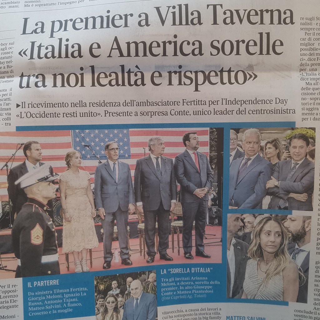 Mentre gli Stati Uniti ieri hanno festeggiato l’Indipendence Day, l’Italia (priva effettivamente di sovranità) sconta la subordinazione totalitaria a Washington. Prove? La sudditanza di tutto il ceto partitico che bivacca in Parlamento (finta opposizione inclusa) e soprattutto a Palazzo Chigi. Alla festa a Villa Taverna oltre ai camerati e alle camerate d’Italia, c’era pure il Conte bis per omaggiare i primi guerrafondai al mondo, responsabili impuniti di crimini contro l’umanità.