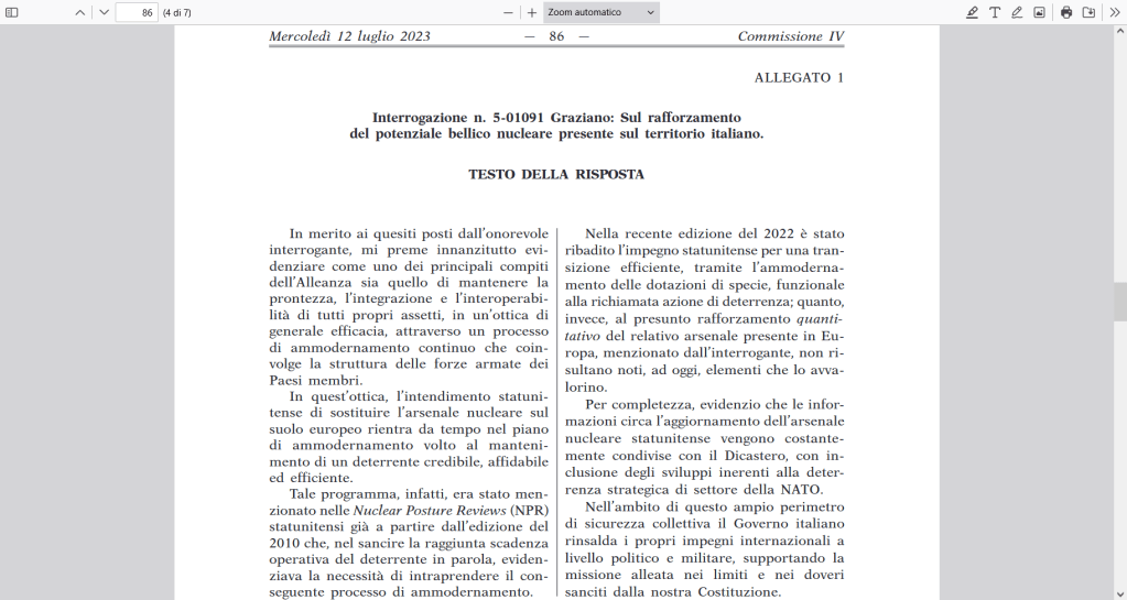 Non è tutto: c’è di peggio. A proposito della presenza in Italia dell’arsenale nucleare di guerra targato Washington, la sottosegretaria alla Difesa Isabella Rauti (figlia dell’eversore nero Pino Rauti), il 12 luglio 2023 in risposta ad un’interrogazione parlamentare, ecco cosa risponde ufficialmente, a nome dell’esecutivo tricolore meloniano, in palese violazione delle legge italiana di ratifica del Tnp (legge 131/1975), ma soprattutto dell’articolo 11 della Costituzione repubblicana: