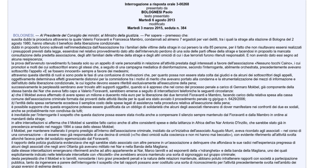 Bolognesi, inoltre, ha manifestato, giustamente, in una dichiarazione allo stesso organo di informazione, la preoccupazione sulla presenza di una rete di protezione per i terroristi neri.