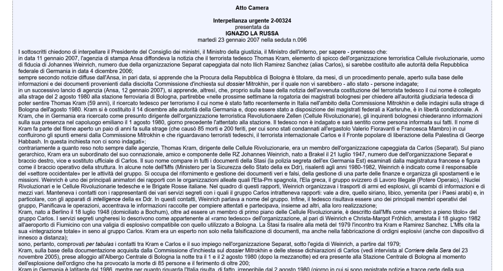 Ancora oggi, chi alberga a Palazzo Chigi vuole nascondere la verità e censurare la conoscenza, schiacciando la libertà. Eppure, si tratta di una tragedia sempre attuale, ma dai risvolti oscuri. Vediamo chissà chi lo sa. Nel 2007, per l’esattezza il 23 gennaio, onorevoli camerati e pure patentati squadristi neofascisti, al cui vertice bivacca l’attuale capo del Senato, il conclamato collezionista di busti mussoliniani, tale Ignazio Benito La Russa, mediante l’interpellanza urgente 2/00324, tentarono di depistare la verità indicibile sulla strage di Bologna, annegandola nell’inventata “pista palestinese” sostenuta anche dal mentitore per eccellenza e depistatore numero 1, tale Francesco Cossiga (propinatore dello stesso copione sull’eccidio del 27 giugno 1980 nel Tirreno). Prima ancora, unitamente a Giorgia Meloni, gli stessi neofascisti elevati addirittura al rango parlamentare grazie allo sdoganamento di Silvio Berlusconi (tessera P2 numero 1816) – sia pure per conto terzi – avevano messo nero su bianco che la “verità sulla strage di Ustica non si saprà mai”. A proposito: il predetto La Russa è politicamente degno di presiedere Palazzo Madama? Ancora adesso, precipitando nel ridicolo Giorgia Meloni insiste pubblicamente con l’inesistente responsabilità palestinese, ovvero una menzogna seriale amplificata dalla propaganda tricolore, senza minimamente ammettere la palese matrice neofascista. Israele docet.