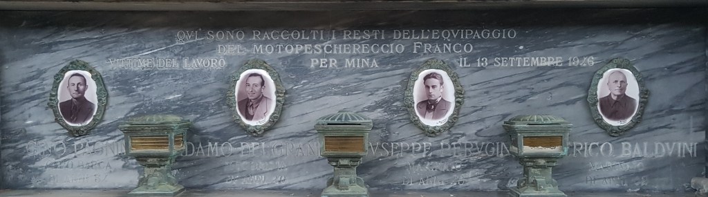 «Qui sono raccolti i resti dell’equipaggio del motopeschereccio Franco. Vittime del lavoro per mina il 13 settembre 1946».
