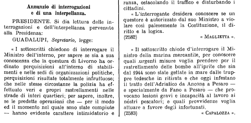 Resoconto stenografico: 28 novembre 1959. Questo atto parlamentare di sindacato ispettivo a firma del senatore comunista Enzo Capalozza di Fano, smentisce una volta per tutte le menzogne sulle presunte e mai dimostrate bonifiche ambientali annunciate dai governi tricolore nei primi anni Cinquanta. Gianni Lannes