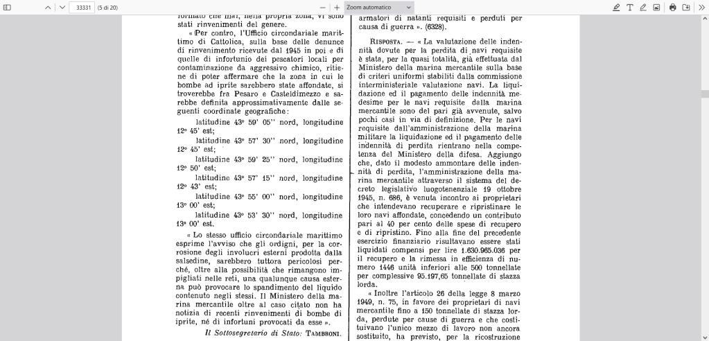 La mappa militare inglese numero 209, risalente al 1945, riportata anche dal Portolano italiano, conferma le informazioni fornite dai lavoratori del mare. Inoltre, anche i documenti dell’Unep (agenzia ambientale delle Nazioni Unite) e della Commissione europea attestano lo stato disastroso dei luoghi, ridotti a discarica bellica.