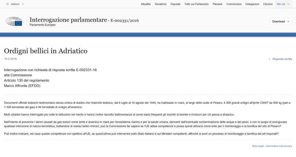 Nel 2016 il caso approdò al Parlamento europeo tramite un atto interrogativo alla Commissione Ambiente.