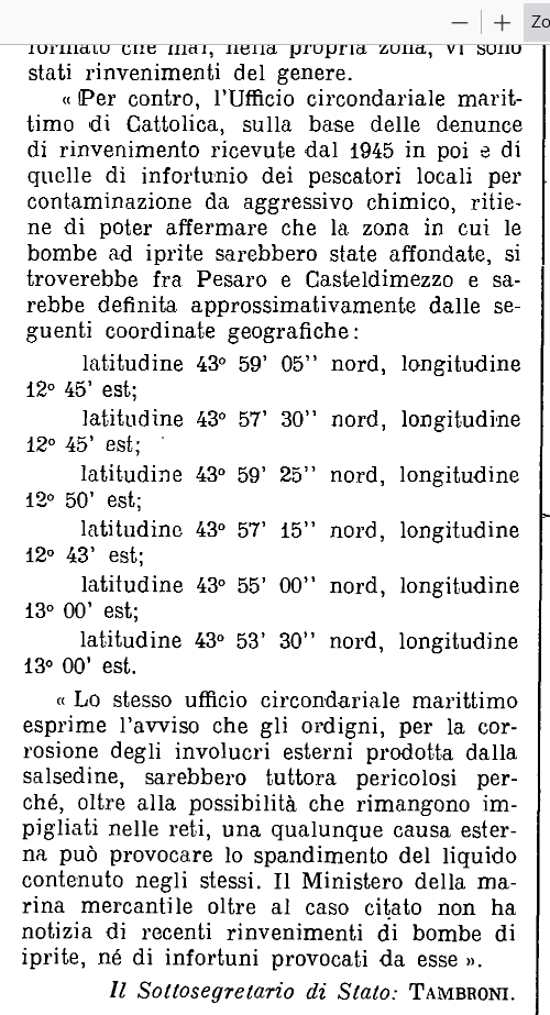 Uno, nessuno e centomila: si tratta di ordigni imbottiti con iprite e arsenico (cancerogene). Sono ancora in fondo al mare Adriatico, dirimpetto alla costa marchigiano-romagnola, a bassa profondità (12-20 metri), a una distanza variabile dalle 2,5 alle 5 miglia. Le conseguenze per l’ambiente e la salute umana sono catastrofiche.