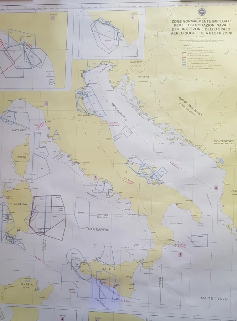 Da decenni i mari che avvolgono l’Italia sono utilizzati per manovre di guerra mascherate da esercitazioni ordinarie. Singolare coincidenza: proprio dinanzi alla fascia costiera che si estende dall’Abruzzo alle Marche, incombe una gigantesca area militare (denominata “T842”), marcata dalla carta nautica numero 1050 dell’Istituto Idrografico di Genova. Inoltre, gli avvisi ai naviganti e i portolani, segnalano attività militari quasi ovunque nelle acque marine del Belpaese.