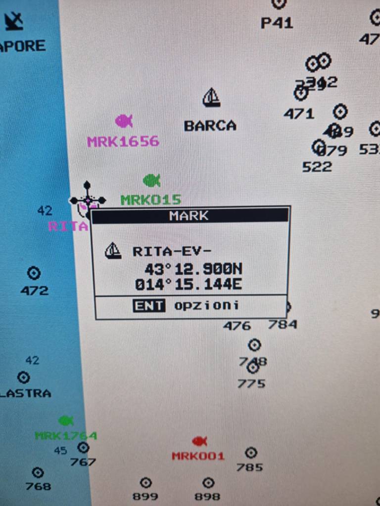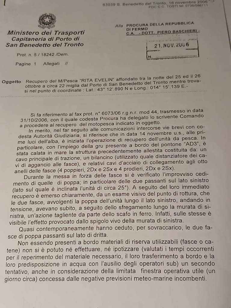 Ecco il punto esatto nel Mare Adriatico – a largo tra Pedaso e Porto San Giorgio – in cui ad 80 metri di profondità, giace il relitto del Rita Evelin di San Benedetto del Tronto. All’alba del 26 ottobre 2006, morirono i pescatori Francesco Annibali, Ounis Gasmi e Luigi Luchetti.