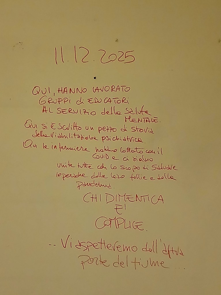 A Pesaro nel quartiere Muraglia c’erano una volta – i cosiddetti “matti”, liberi di uscire grazie alla rivoluzione Basaglia. Poi i padroncini del vapore locale hanno deciso di impiantare un nuovo ospedale pubblico in un’area classificata ufficialmente ad “elevato rischio idrogeologico e sismico”. Così, di punto in bianco, 48 persone senza voce (etichettate “pazienti psichiatrici”), sono state trasferite alla stregua di rifiuti e peggio del bestiame, senza uno straccio di spiegazione e senza essere minimamente interpellate da una residenza pubblica (dov’erano residenti e avevano una vita attiva) in un centro privato ad Apsella. Le loro opere d’arte – dipinti e disegni – sono finite in discarica, dove però alcune anime sensibili le hanno salvate dalla distruzione.