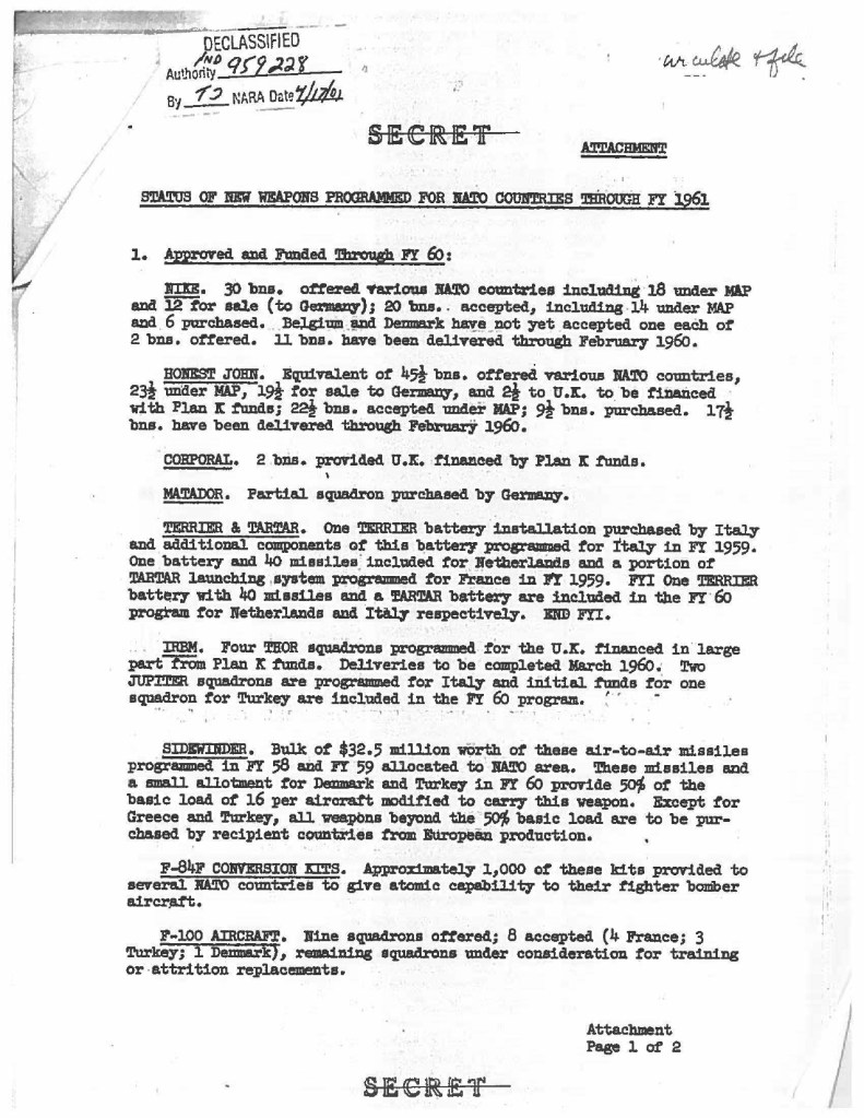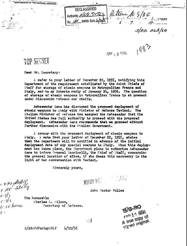 Alcuni documenti (secret e top secret) sono stati declassificati a Washington nell’indifferenza generale. In sintesi: le prime armi nucleari schierate in Italia sono state due battaglioni di missili MGR-1 e MGR-5, messe in funzione nel 1955. A questi si sono poi aggiunti, negli anni ’60, 90 missili Hercules con testate nucleari W31. Ma nessuno di questi era sotto controllo italiano. Gli Stati Uniti tenevano il controllo totale. L’Italia aveva perso la guerra ed era trattata militarmente come una colonia dagli Stati Uniti; le condizioni di subordinazione non sono mutate.
