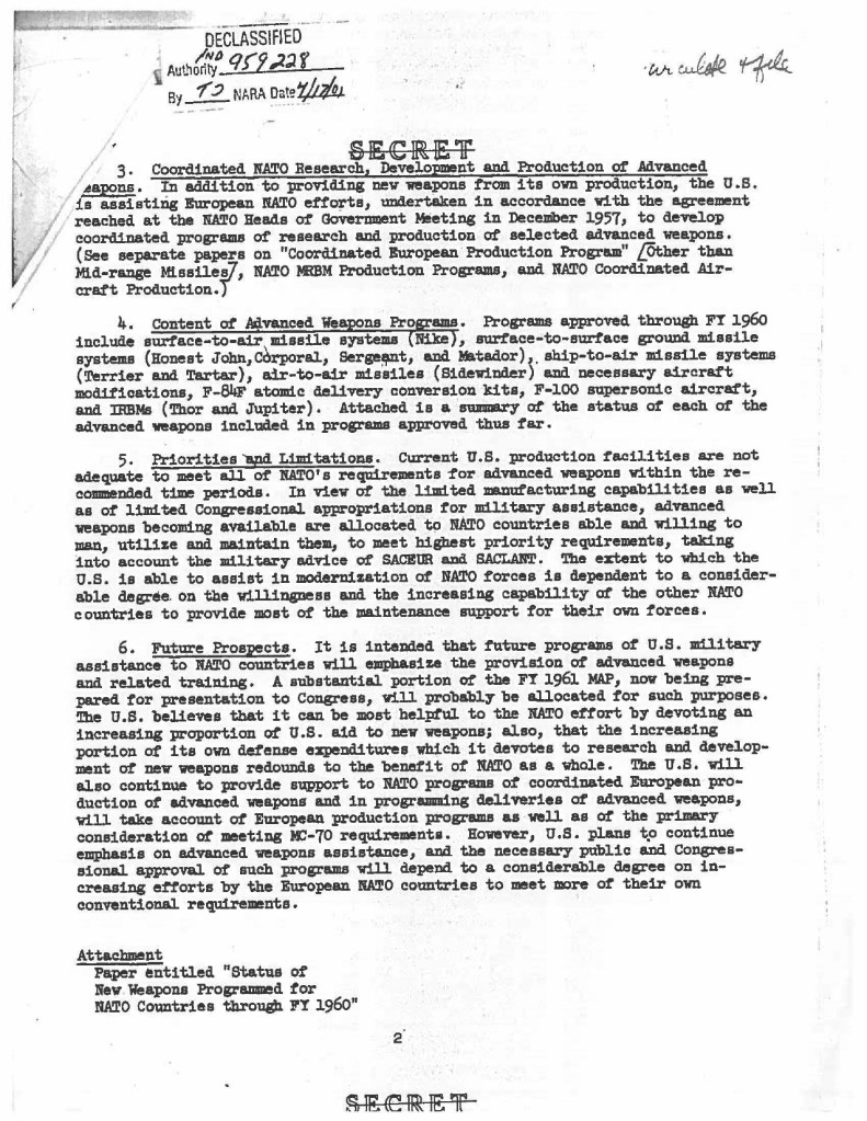 Il ministro della difesa Paolo Emilio Taviani, il 29 novembre 1956 dichiara che il governo sta cercando di persuadere gli alleati a «rimuovere ingiustificate restrizioni per le nazioni Nato ad accede alle nuove armi.» In altre parole, l’Italia vuole la sua bomba atomica.