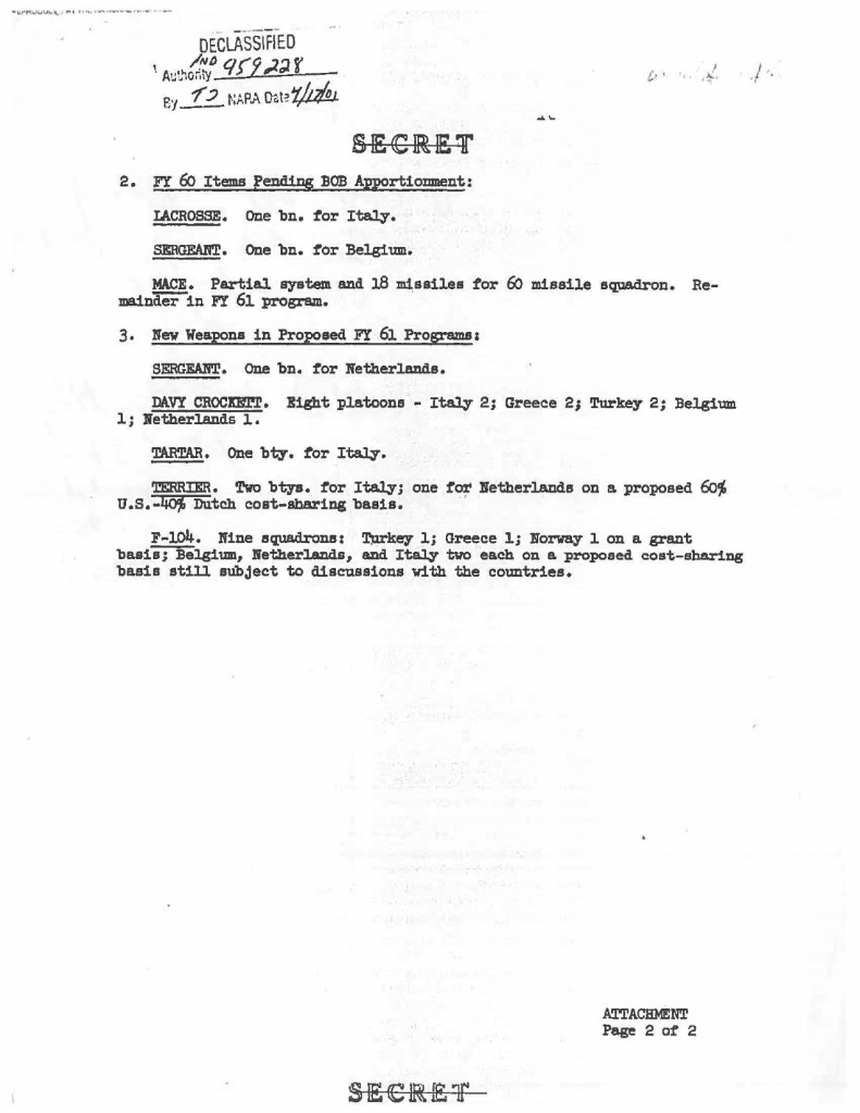 La pressione politica sugli Stati Uniti funziona. Il 26 marzo del 1959 il governo firma un accordo con gli Stati Uniti per ricevere 30 missili balistici Jupiter a raggio intermedio da operare dalla base italiana di Gioia del Colle, sotto controllo dell’Aeronautica militare italiana.