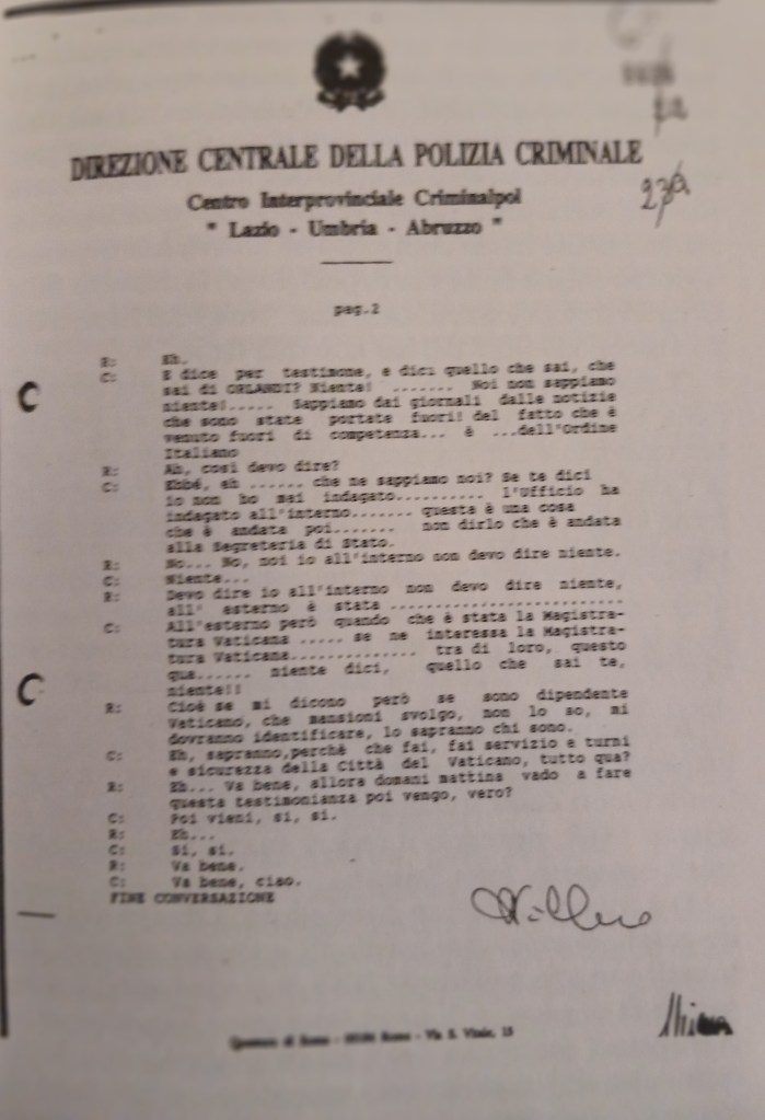 Il 22 giugno 1983 sparì la quindicenne Emanuela Orlandi, cittadina residente nello Stato di San Pietro. Mentre a tutt’oggi si susseguono insabbiamenti e depistaggi (amplificati dai mass media e da innumerevoli dilettanti di cronaca nera e speculatori televisivi d’ogni risma), nel segretissimo dossier del caso Orlandi in possesso del Vaticano, è indicato il luogo dove Emanuela è stata uccisa la sera stessa della scomparsa. A tutte le rogatorie inviate dalla magistratura italiana non è mai stata offerta risposta. Significativa del livello di omertà vaticana l’intercettazione telefonica di Raul Bonarelli. Perché non sono mai stati interrogati monsignor Gianni Danzi e padre Yvan Bertorello? Tra le fine del 1996 e l’inizio del 1997, a parte circa 350 milioni (stipendi del corpo), cosa è stato rubato dalle due casseforti delle guardie svizzere, di cui una nell’ufficio del tenente colonnello Estermann?