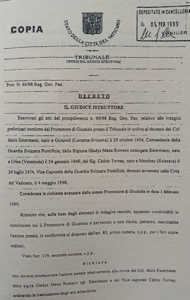 La sera del 4 maggio 1998 verso le 21, sempre dentro le sacre mura di San Pietro, hanno mandato in onda una strage, con l’uccisione a colpi di pistola: a perdere la vita Alois Estermann (appena nominato comandante delle guardie svizzere), sua moglie Gladys Meza Romero (agente segreto con copertura diplomatica venezuelana) e l’innocente vice caporale elvetico Cédric Tornay, assassinato al termine del suo turno di guardia con una bastonata al capo e poi usato come ideale capro espiatorio.