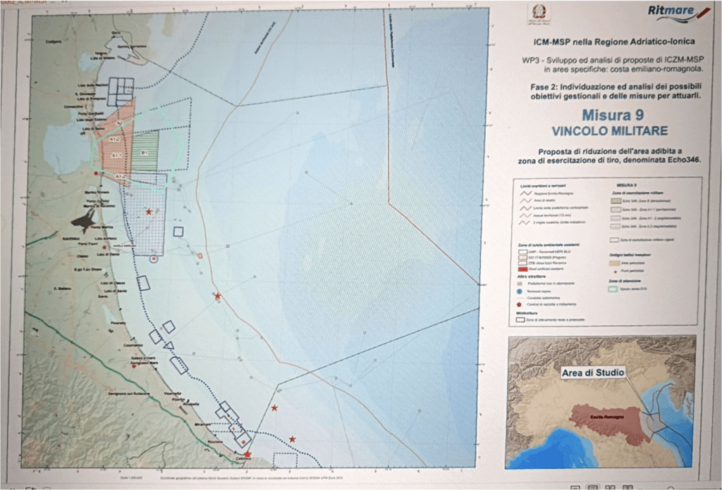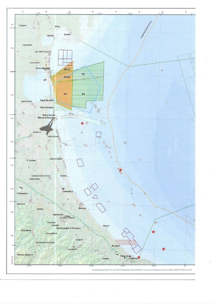 Il pesca luna è un pelagico abituato a nuotare in mare aperto. Si tratta di una specie protetta dalla direttiva Habitat e inserita dall’Unione internazionale per la conservazione della natura (Iucn) nelle specie a rischio. Sono pesci che vivono nella colonna d’acqua, vale a dire tra i 50 e i 100 metri di profondità, proprio dove operano nell’Adriatico sommergibili ed unità navali della Nato, che emettono anche onde sonore a potenza variabile che spesso disorientano e stordiscono i pacifici abitatori marini. Peraltro, la zona marina dinanzi alla città di Ravenna, è un’ampia area militare adibita a poligono bellico. Le stelline rosse nelle due mappe, indicano le discariche di ordigni inesplosi (da Ravenna a Cattolica, fino a Gabicce).