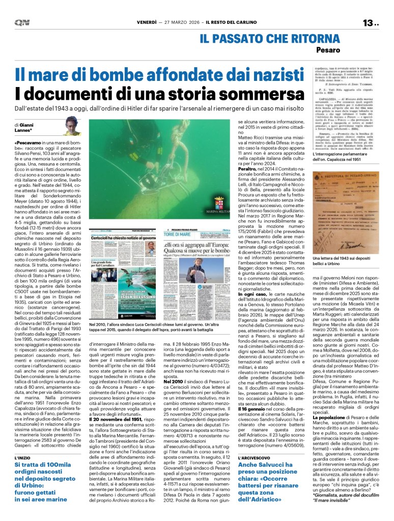 “Alcuni studi bibliografici, le interviste poste agli operatori della pesca e le indagini condotte in alcune aree pilota hanno permesso di evidenziare come la presenza di armi chimiche nei mari italiani sia accertata così come la presenza di prodotti di degradazione dell’iprite”.