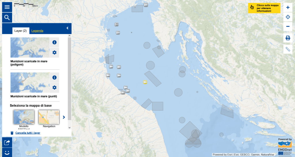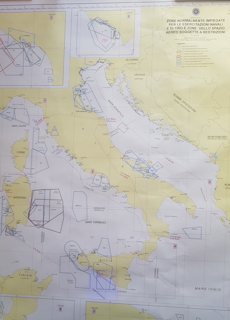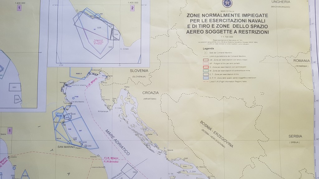 Giochi di guerra in tempo di pace. Dove? Nel Mare Adriatico: versante italiano, soprattutto al centro-nord. Basta aprire gli occhi, oppure consultare la mappa nautica numero 1050 dell’Istituto Idrografico della Marina di Genova (una carta ufficiale derllo Stato italiano), per rendersi conto, ad esempio che da Pescara a Trieste passando per San Benedetto del Tronto (dove al largo di Pedaso è stato affondato dalla Nato il peschereccio Rita Evelin il 26 ottobre 2006 con mare calma piatta e sono stati assassinati tre pescatori), poi Fano, Pesaro, Gabicce, Cattolica, Cervia, Ravenna fino a Venezia e oltre, è un pullulare di zone militarizzate prospicienti la costa e pure le città; aree militari che incombono ovunque, in barba alla Costituzione repubblicana italiana (articolo 11).