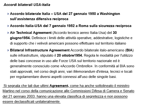 Il primo accordo, denominato Air Technical Agreement, fu siglato il 30 giugno 1954. Definisce i limiti delle attività operative, addestrative, logistiche e di supporto che i velivoli americani possono effettuare sul territorio italiano. Il secondo, il Bilateral Infrastructure Agreement (BIA), risale al 20 ottobre 1954 ed è conosciuto come «Accordo Ombrello»: regola le modalità con cui le Forze USA utilizzano le basi concesse loro sul territorio nazionale. Da esso derivano, nel corso degli anni, vari Memorandum d’intesa — tecnici e locali — per disciplinare i singoli siti.