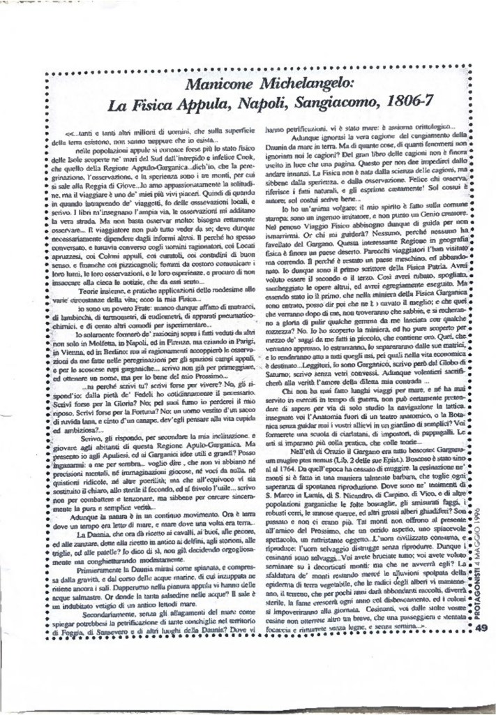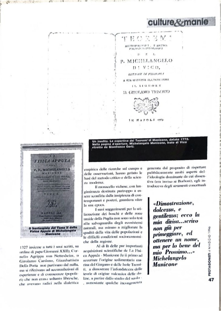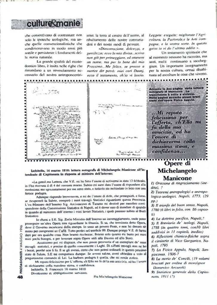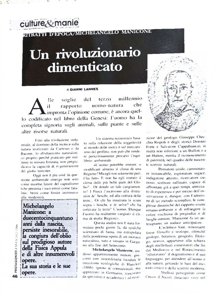 Esattamente due secoli e venti anni fa, Michelangelo Manicone, un dimenticato scienziato del Mezzogiorno d’Italia (considerato un “eretico”: autore di innumerevoli opere scientifiche e filosofiche), nato a Vico del Gargano il 4 marzo 1745, affrontava già l’origine dei mutamenti climatici indotti dall’uomo e coniava il termine ecologia, 60 anni prima del tedesco Haeckel. Un fatto è accertato da una lettera autografa: non morì a Ischitella (luogo nativo del giurista Pietro Giannone) il 18 aprile 1810.