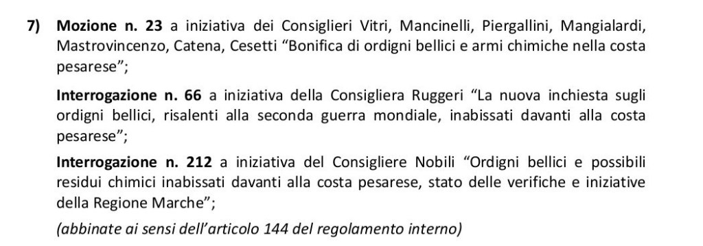 Parola d’ordine alla prova dei fatti: “me ne frego”. Evidentemente l’inquinamento bellico del mare non è rilevante per i politicanti locali – lautamente stipentiati con denaro pubblico – che fanno capo ad Acquaroli, quello che gravita nel cerchio magico delle Meloni. Oggi martedi 14 aprile 2026, erano in discussione in Consiglio regionale ad Ancona, alcune interrogazioni e una mozione, tutti atti relativi alle armi chimiche nel mare di Pesaro e dintorni. Ancora una volta, dopo appena 4 mesi di incredibili rinvii, è saltata ancora una volta la discussione su una gravissima situazione (documentata) che mette a repentaglio la salute dell’ignara popolazione e avvelena l’Adriatico. Insomma, un atto di irresponsablità istituzionale.