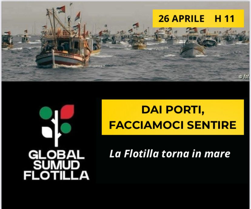 Nell’equipaggio in partenza dalla Sicilia ci sono anche uomini e donne delle Marche e della Romagna. I porti dell’Adriatico si stanno mobilitando: da Ravenna a San Benedetto del Tronto. Il 26 aprile, alle ore 11, ritroviamoci nei porti e sui moli per sostenere la Flotilla. Chi può esca in mare. Chi resta a terra faccia sentire la propria presenza con sirene, suoni, campanacci. Per restare umani e non rassegnarci al silenzio. Un’iniziativa di cittadine e cittadini. Contatti per area: Ravenna-Rimini-Riccione-Cattolica-Gabicce: 339.6585214 – Pesaro-Fano: 335.1607427. Da Senigallia a San Benedetto del Tronto: 345.434308.