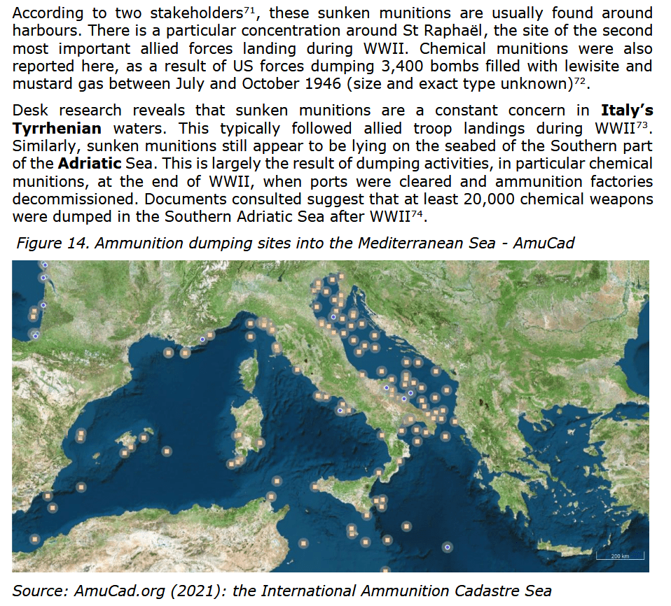 Sugli arsenali di armi chimiche in mare, c’è pure un rapporto (riduttivo, ovvero impreciso ed ampiamente sottostimato e non aggiornato) della Commissione europea e fondi pubblici a cui attingere. Cosa attende l’europarlamentare Matteo Ricci, per impegnarsi concretamente, così come annunciato nell’intervista rilasciata per il docufilm IL MARE INVISIBILE? Proprio dinanzi a Pesaro è segnalata una gigantesca discarica bellica, imbottita di ordigni speciali (iprite e arsenico) che al suo interno racchiude una mezza dozzina di aree dove nel 1944, su un basso fondale (12-15 metri) i nazitedeschi hanno segretamente affondato 100 mila ordigni banditi dalla Convenzione di Ginevra del 1925 (vietati dal 1993 anche dal Trattato di Parigi). Il ministro Tajani, in palese violazione di legge e di accordi internazionali, non ha denunciato questa pericolosissima presenza, mentre il sindaco di Pesaro – Biancani – fa finta di niente.