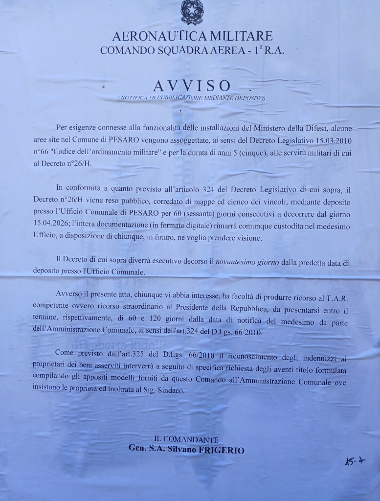 Pesaro, più che per il genio musicale di Rossini è nota all’Alleanza atlantica e al ministero Difesa targato Crosetto, con il nome di “E344”, mentre lo spazio aereo di questo lembo orientale dell’Italia centrale – in chiave bellica – ha assunto – in palese violazione della Costituzione repubblicana e antifascista – le denominazioni di “D87” ed “R26”, ovvero ampie zone di cielo che si estendono senza interruzioni da Fano (“E343”) a Ravenna passando per Rimini (“E345”), come attesta la mappa nautica numero 1050 dell’Istituto Idrografico della Marina (carta ufficiale dello Stato italiano) edita a Genova.