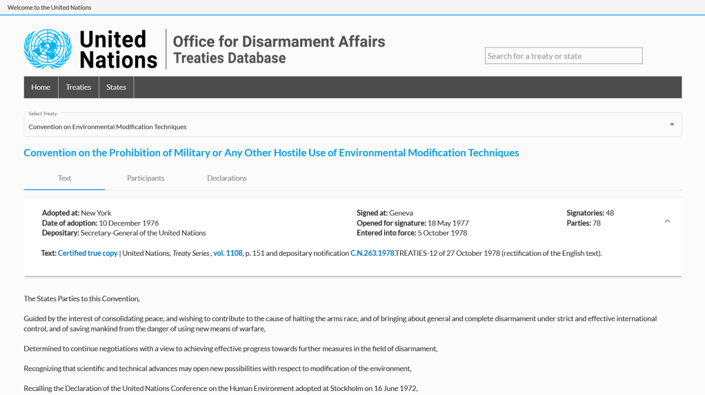 L’Italia ha firmato la Convenzione a Ginevra il 18 maggio 1977 e l’ha ratificata con la legge numero 962 del 29 novembre 1980, a firma del presidente della Repubblica Sandro Pertini. La Convenzione proibisce l’uso militare e ogni altro utilizzo ostile delle tecniche di modifiche ambientali aventi effetti estesi, duraturi o severi. Il termine “tecniche di modifiche ambientali” si riferisce ad ogni tecnica finalizzata a cambiare – attraverso la manipolazione deliberata dei processi naturali – la dinamica, la composizione e la struttura della Terra, incluse la sua biosfera, litosfera, idrosfera e atmosfera, così come lo spazio esterno.